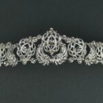Scalloped detail set between two silver bands, a heavenly piece set to please. Diamante fine detailing with clusters of stunning bigger diamantes in-between. 3.3 cm height 20.5 approximate span across. |