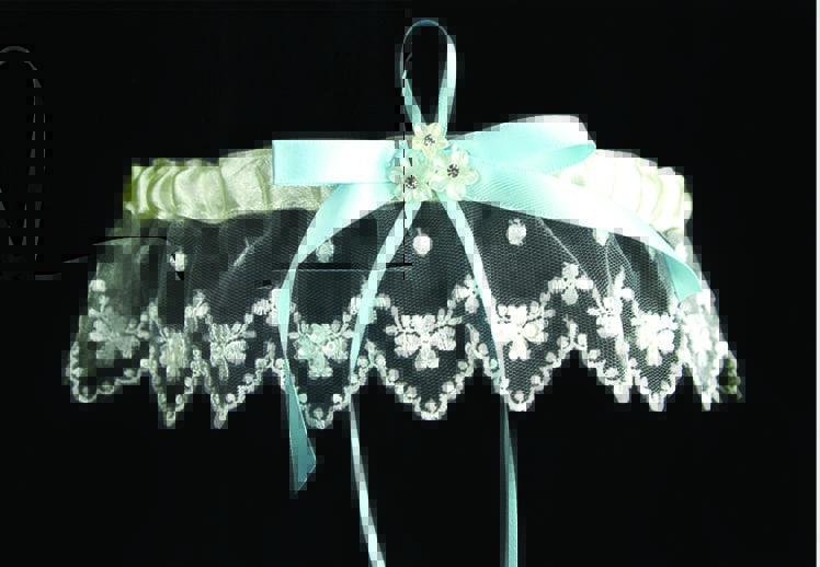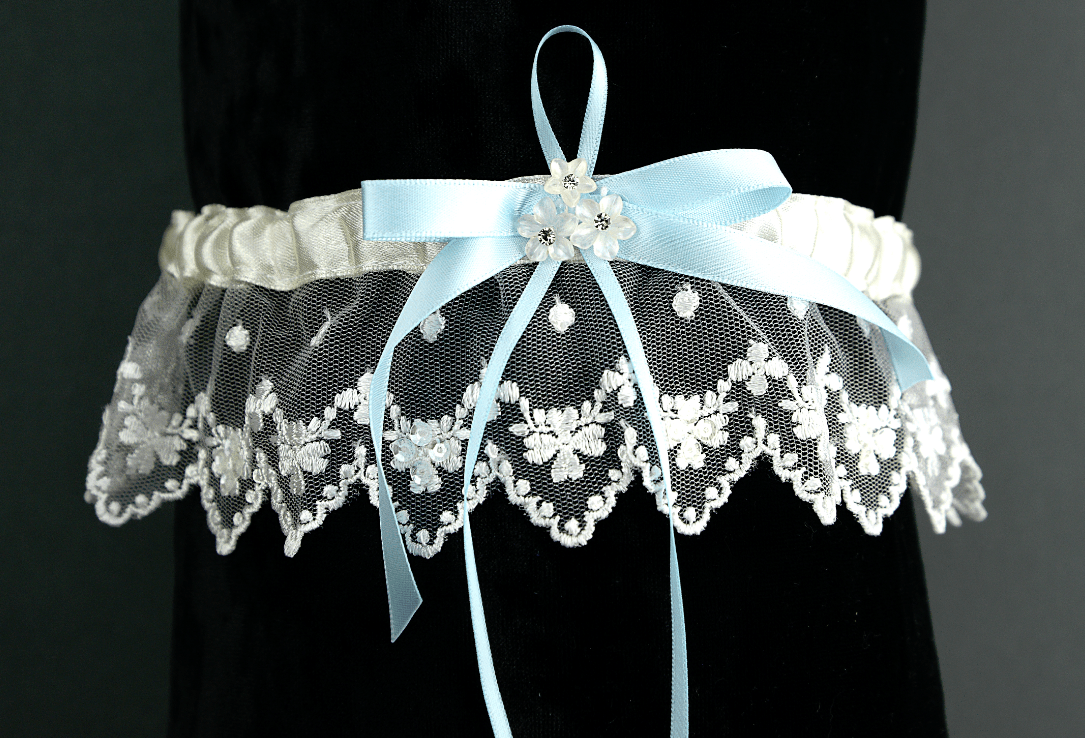 Ivory lace with blue ribbon. Flower and diamante central detailing.