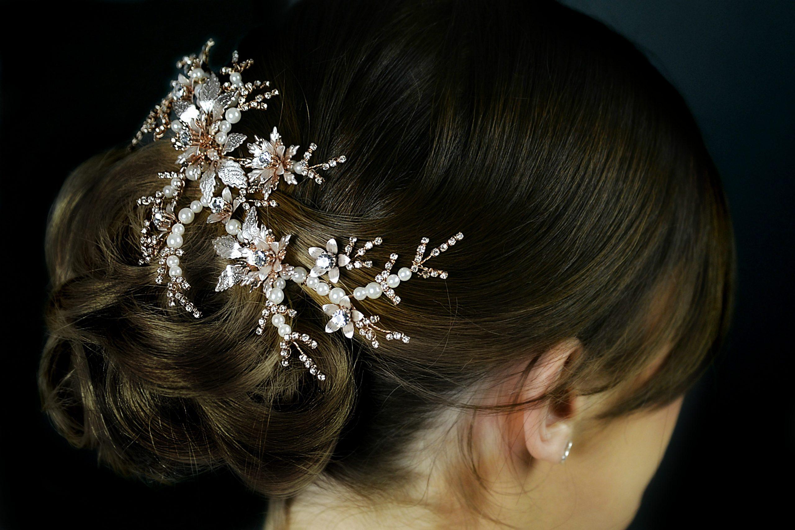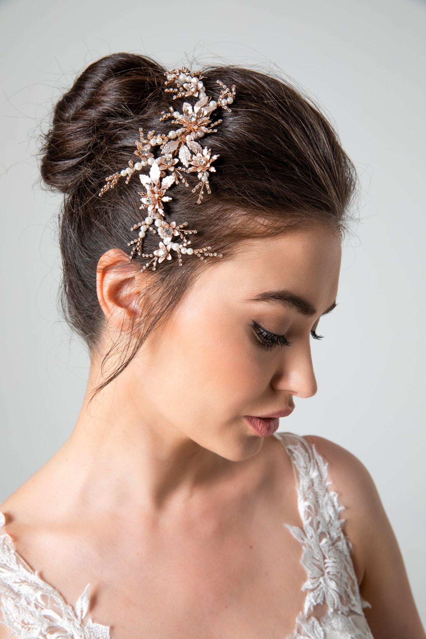 Rose Gold delicate hair clip, made up of diamante flowers and pearls with a beautiful leaf design to finish.