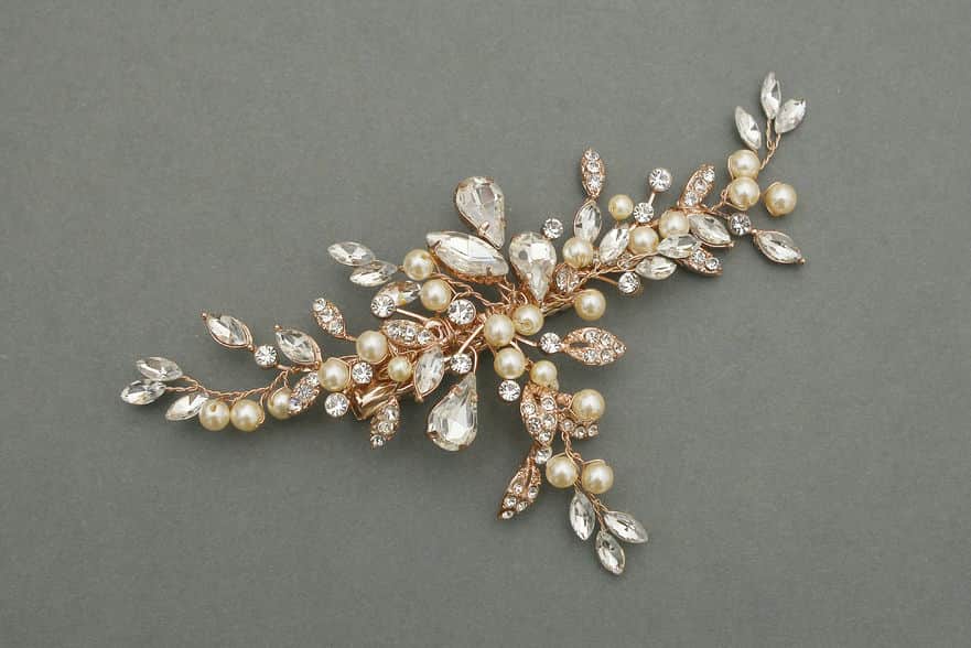 Stunning Rose Gold hair clip with a trio of Diamantes, Pearls and Crystals.