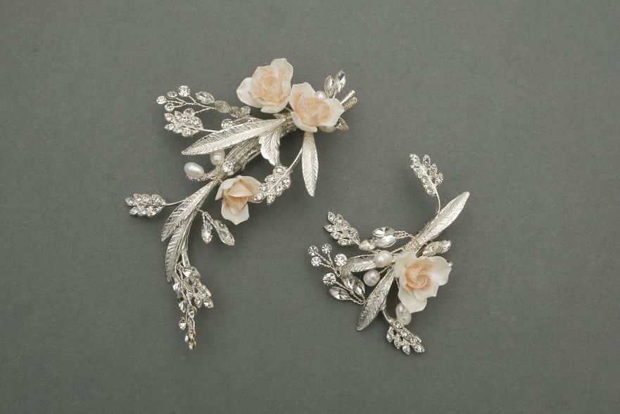 Set of hair clips, 1 slightly larger than the other, blush hand painted ceramic flowers, surrounded by stunning silver leaves and a diamante decoration.