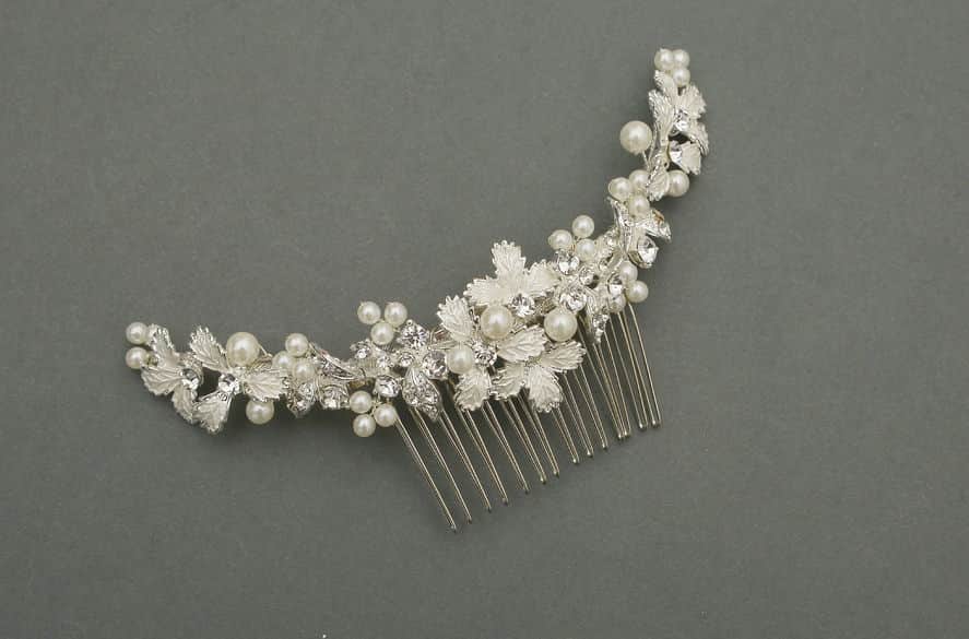 Silver hair comb, beautiful leaf design with a stunning diamante and pearl decoration.