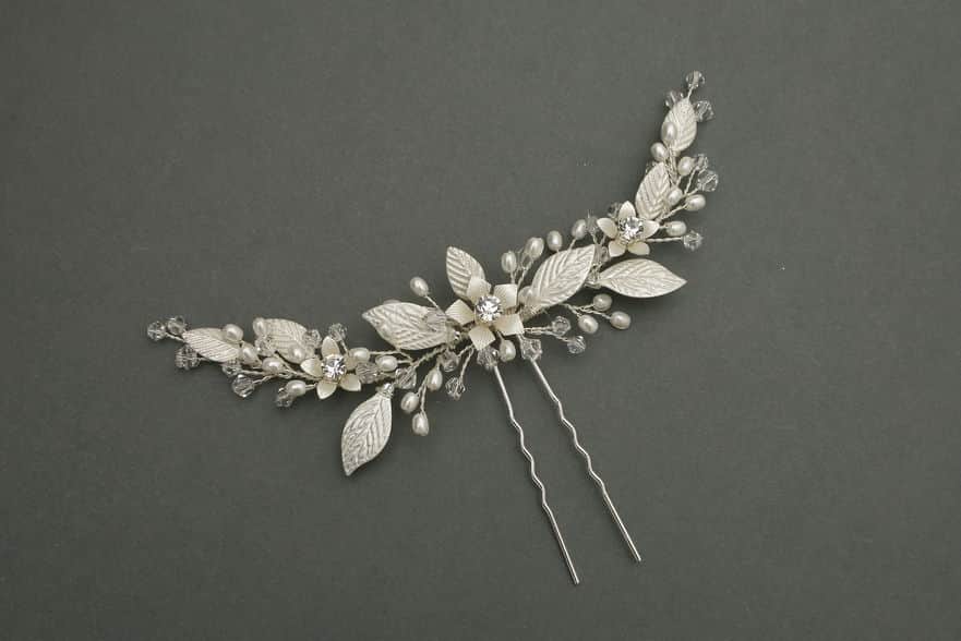 Beautiful hair pin, a trio of Diamantes, Pearls and clear Crystal beads as well as leaves for decoration.