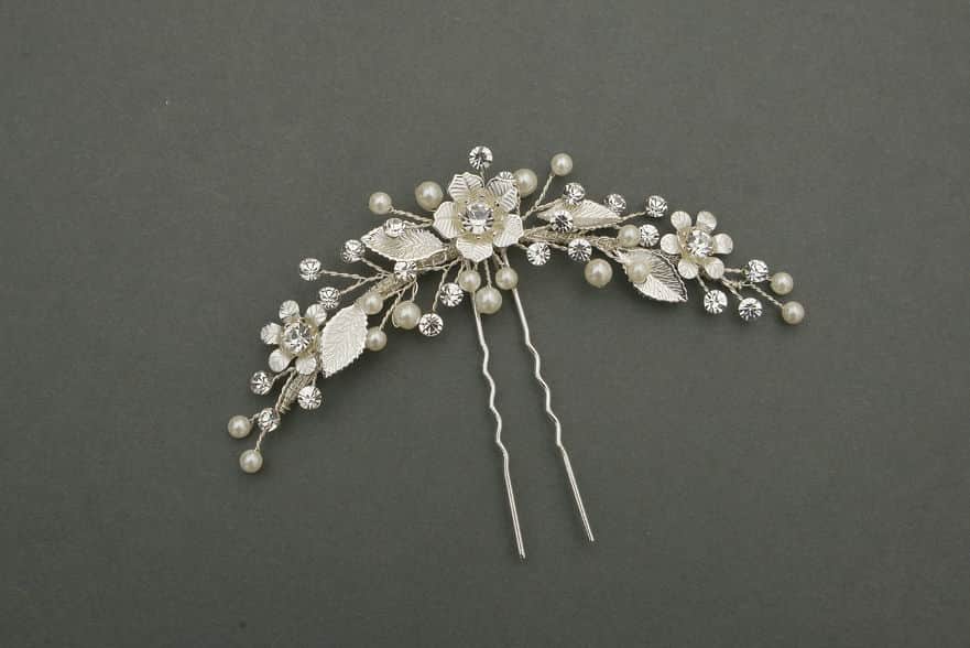 Delicate hair pin made up of silver flowers with Diamante centres, extra Diamantes and pearls for decoration.