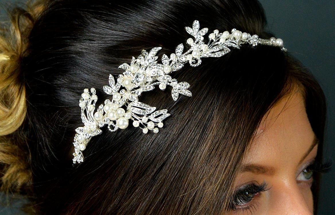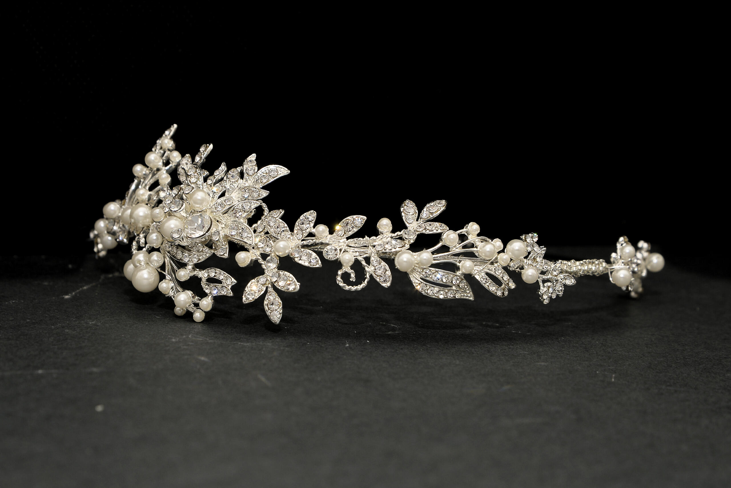 Detailed side tiara with crystal and pearl detailing which continues around the band with the main feature being on the right depending on which way the tiara is worn. Detail spans across approximately 26 cm. Hight off detail is approximately 4-5 cm.