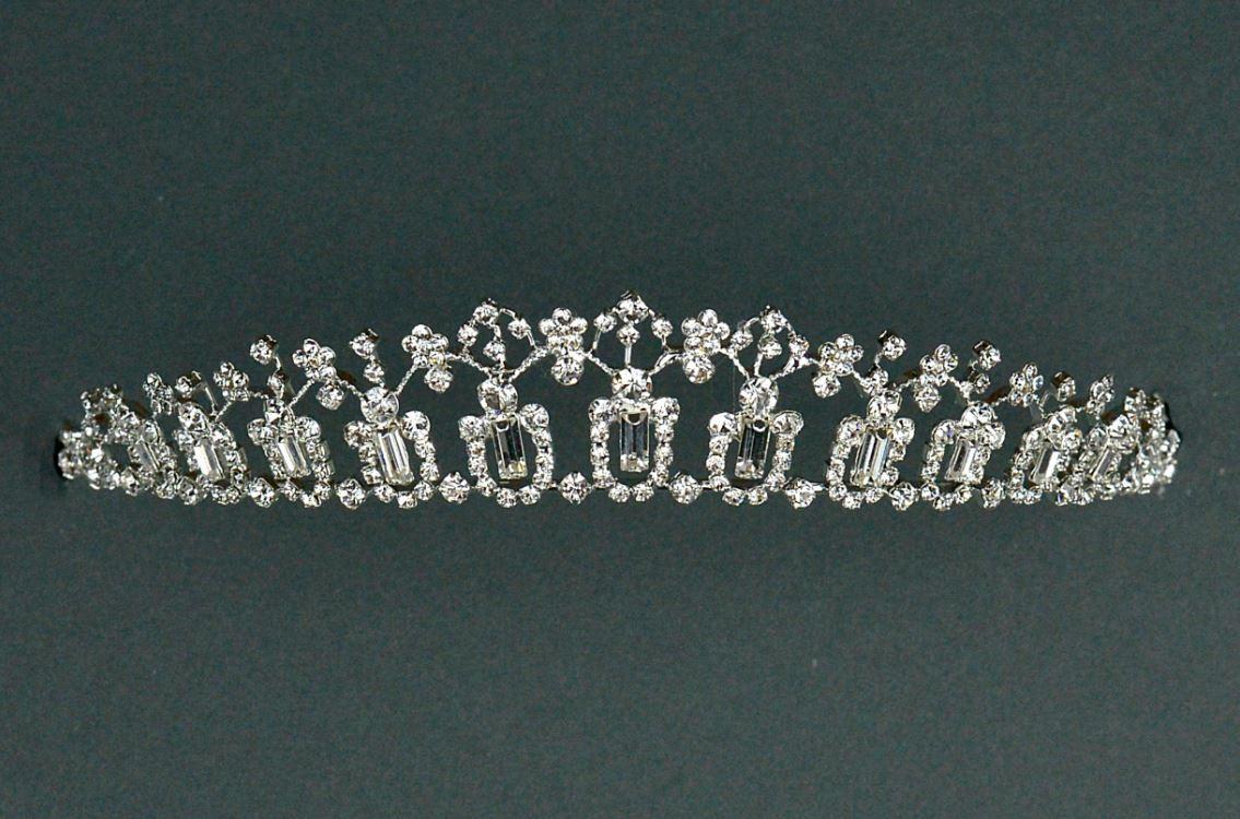 Beautiful arched tiara with abstract crystal shapes. Transform any princess style wedding dress into a dress fit for a queen when styled with this tiara.