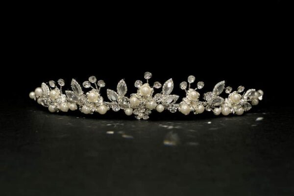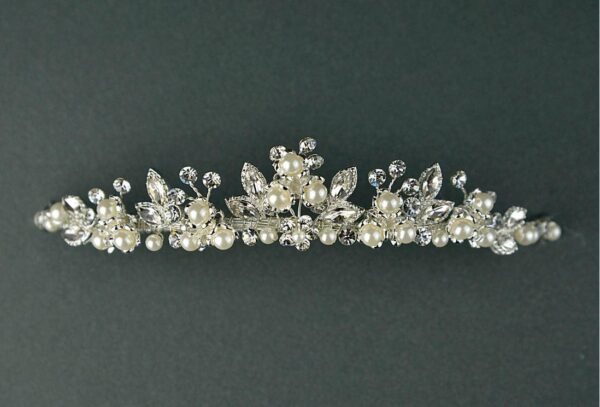 Pearls set in clasps to resemble dainty flowers. Contemporary yet traditional tiara. Diamantes and pearls placed perfectly to fit a true princess. 2.5 in height. 20cm across in adornments.