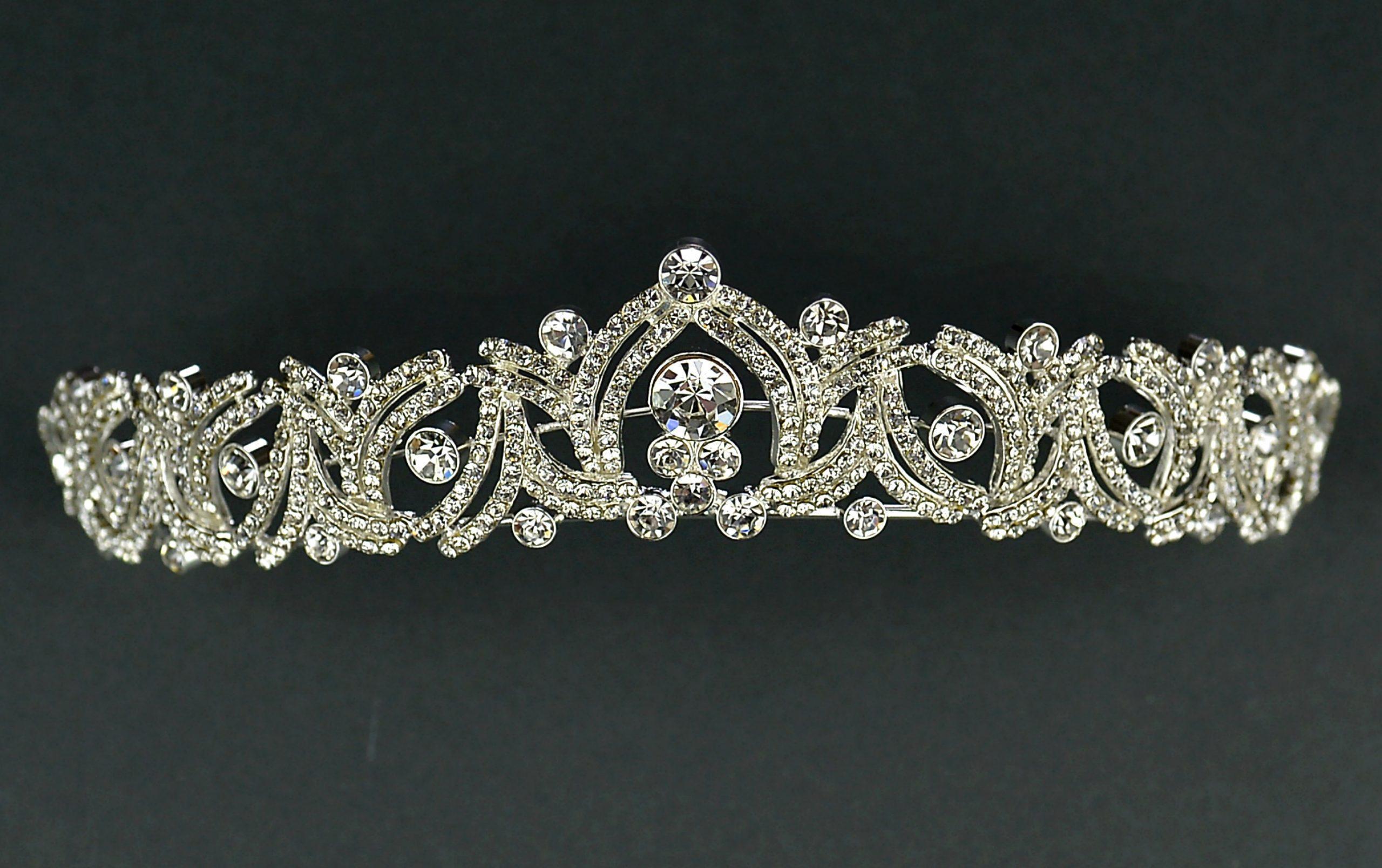 Sitting at 3 cm high this royal, princess style tiara is completed with arched diamante detail with statement diamantes set in-between. Set on two silver bands for extra support which then flow into one.