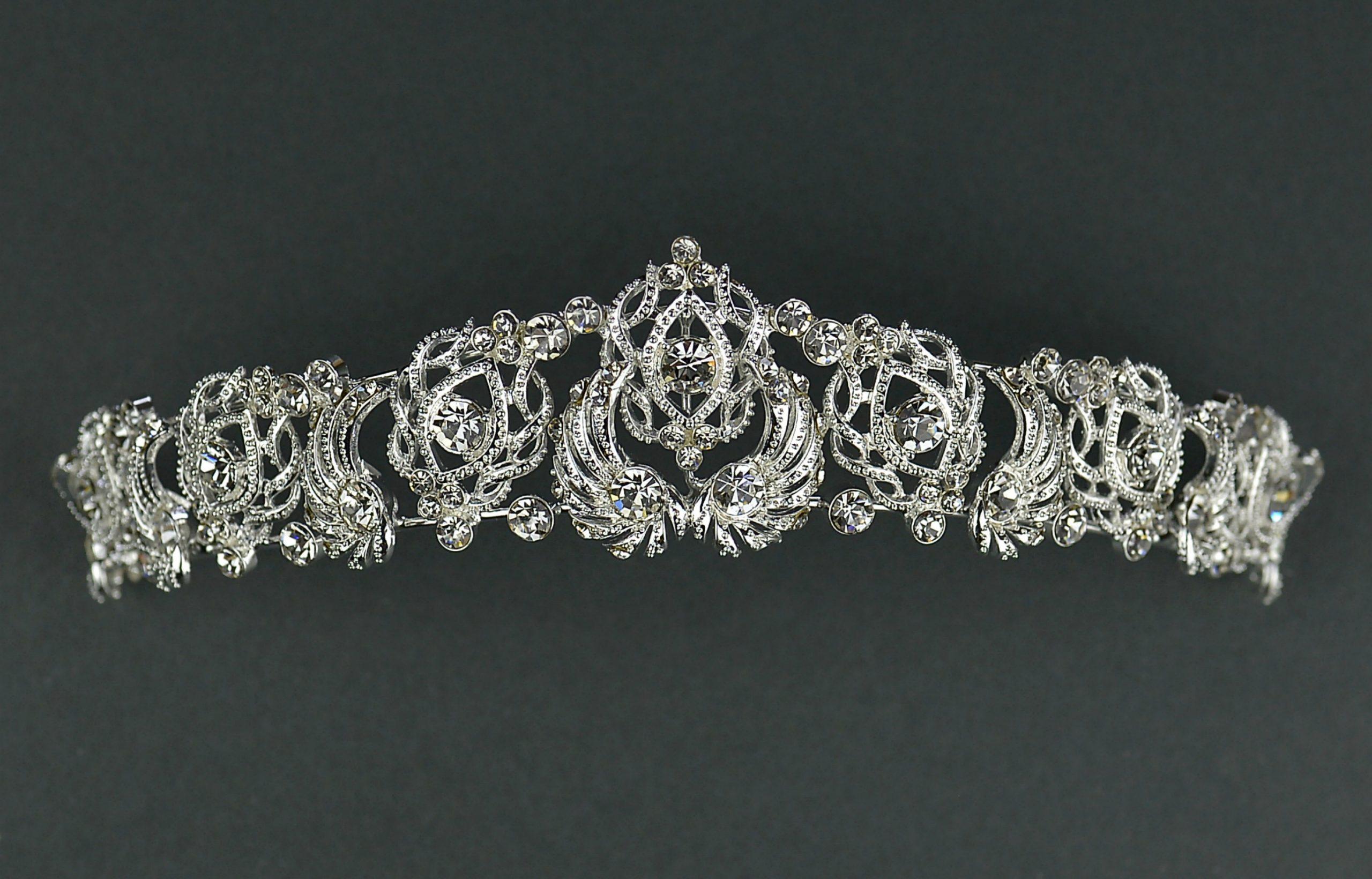 Scalloped detail set between two silver bands, a heavenly piece set to please. Diamante fine detailing with clusters of stunning bigger diamantes in-between. 3.3 cm height 20.5 approximate span across.