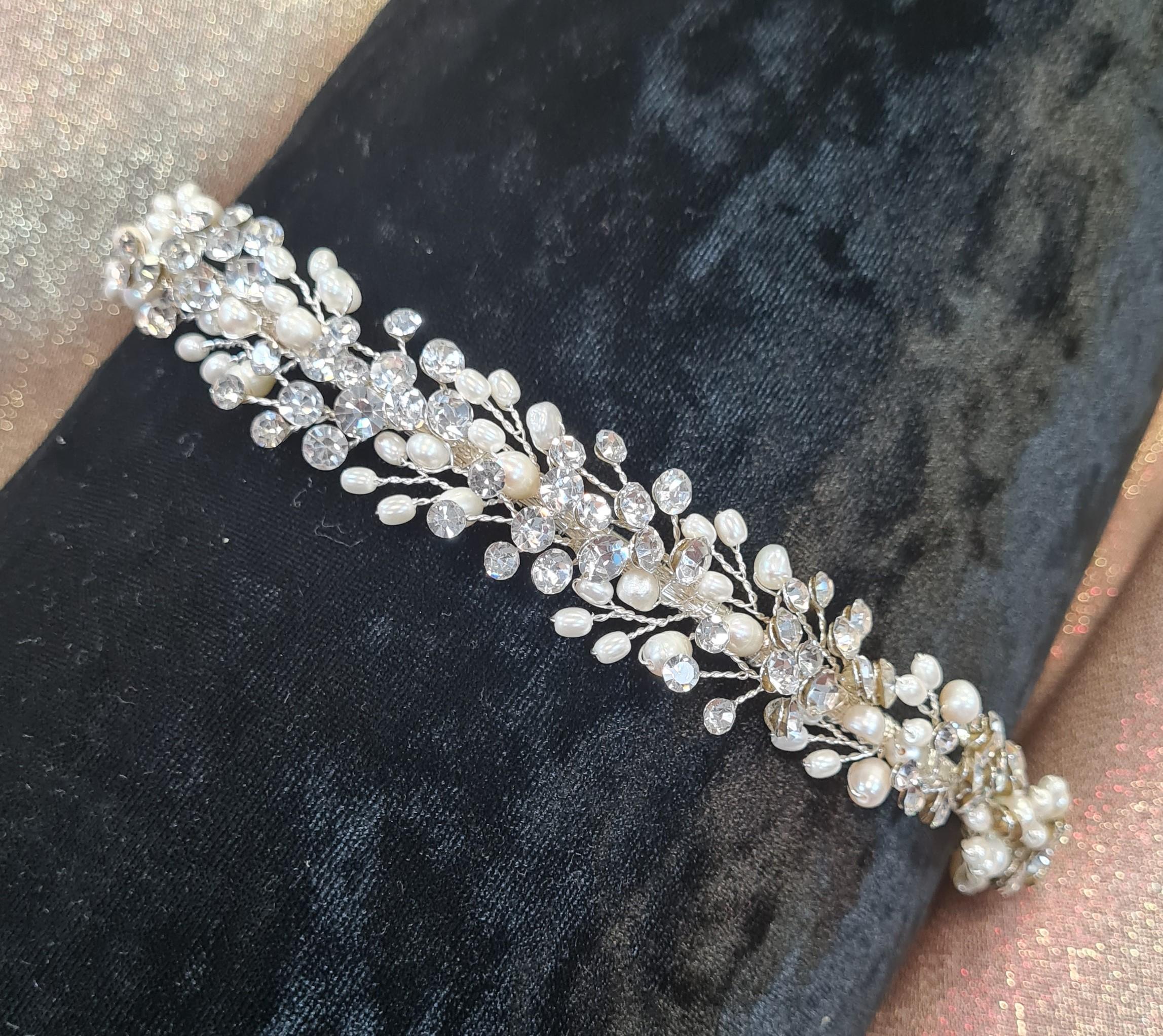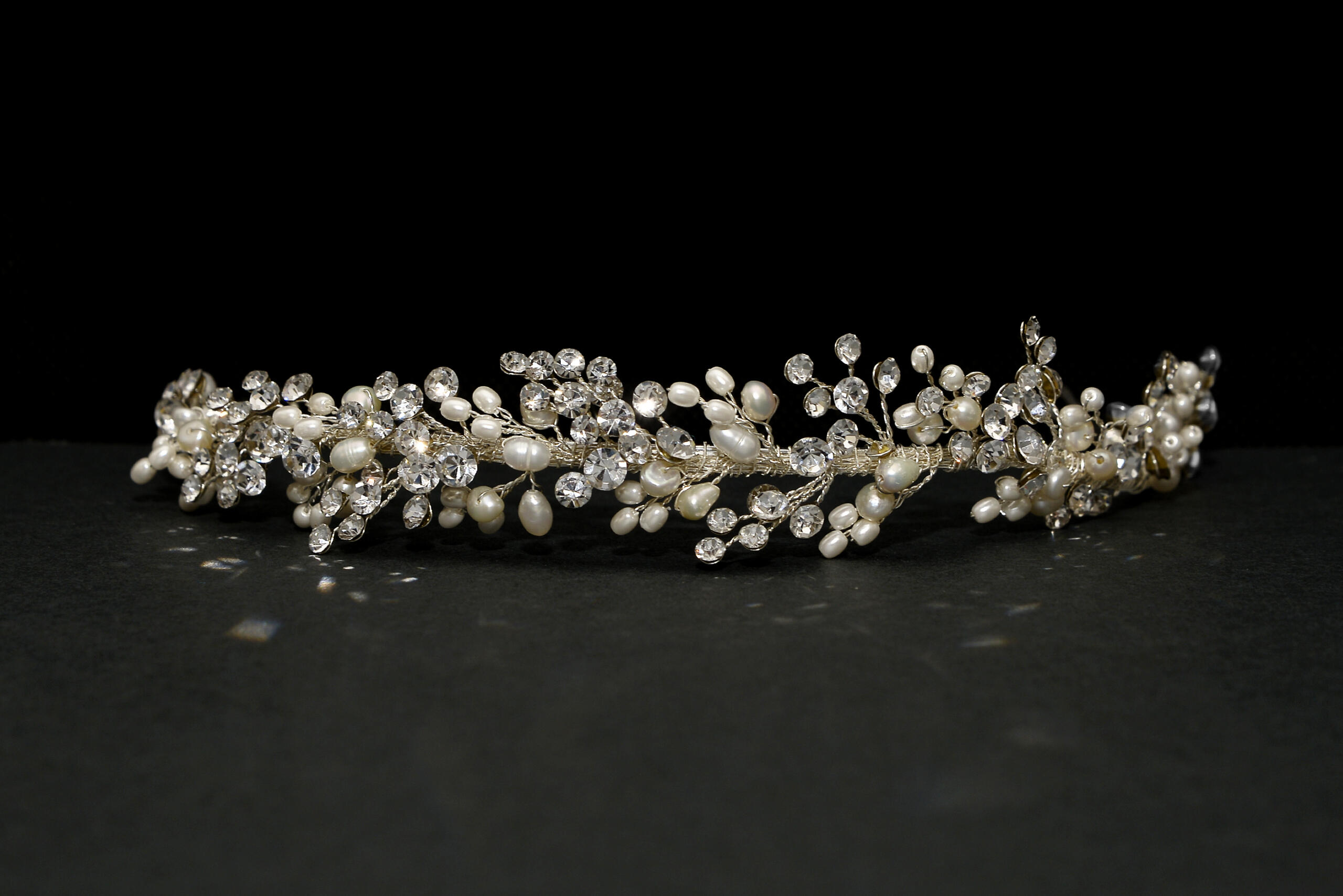 Botanical stems made out of a combination of pearls and diamantes elongated across the tiara band.