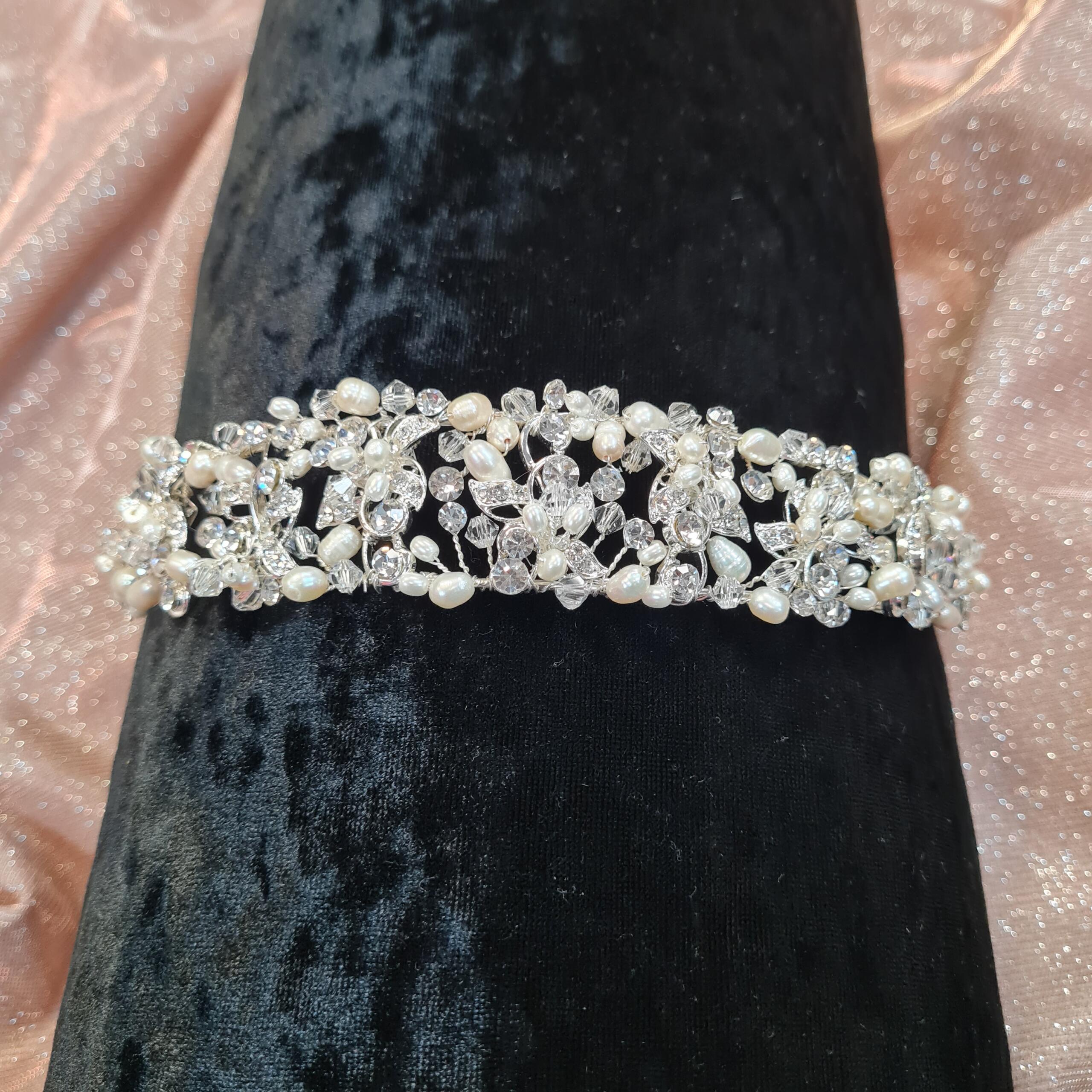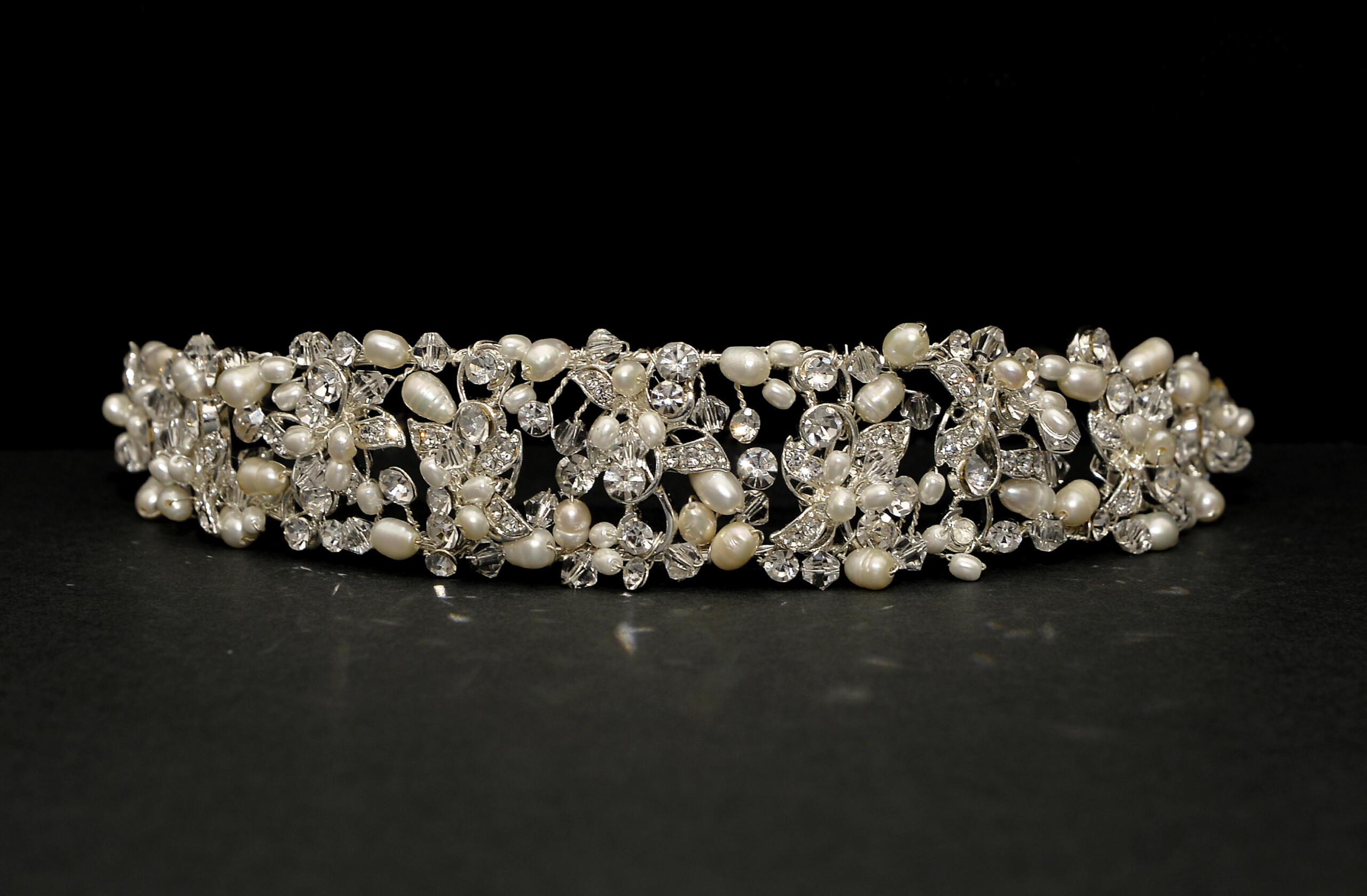 Solid head band style tiara, Diamante, Pearl and crystal beads, 1.5″ at the widest point