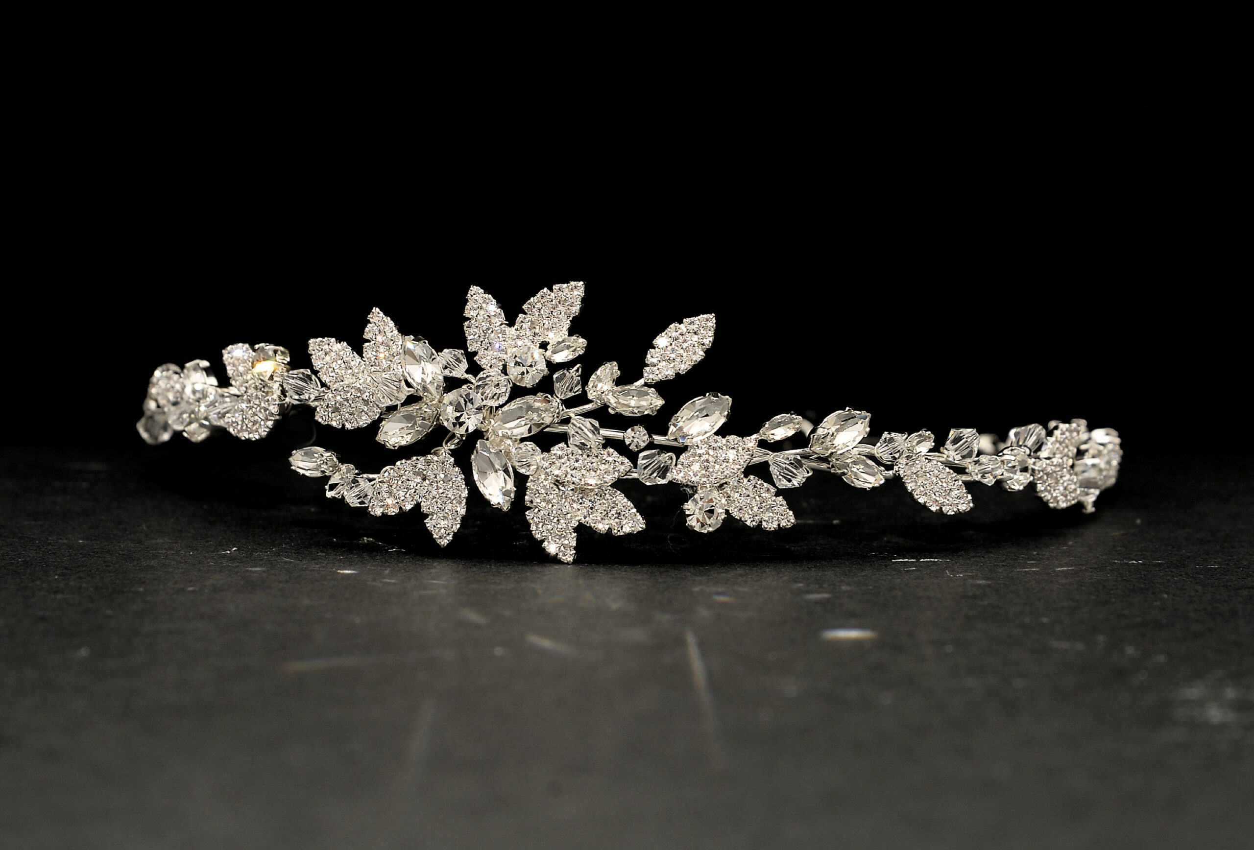 A delicate tiara made up of crystal and diamante flowers and leaves.