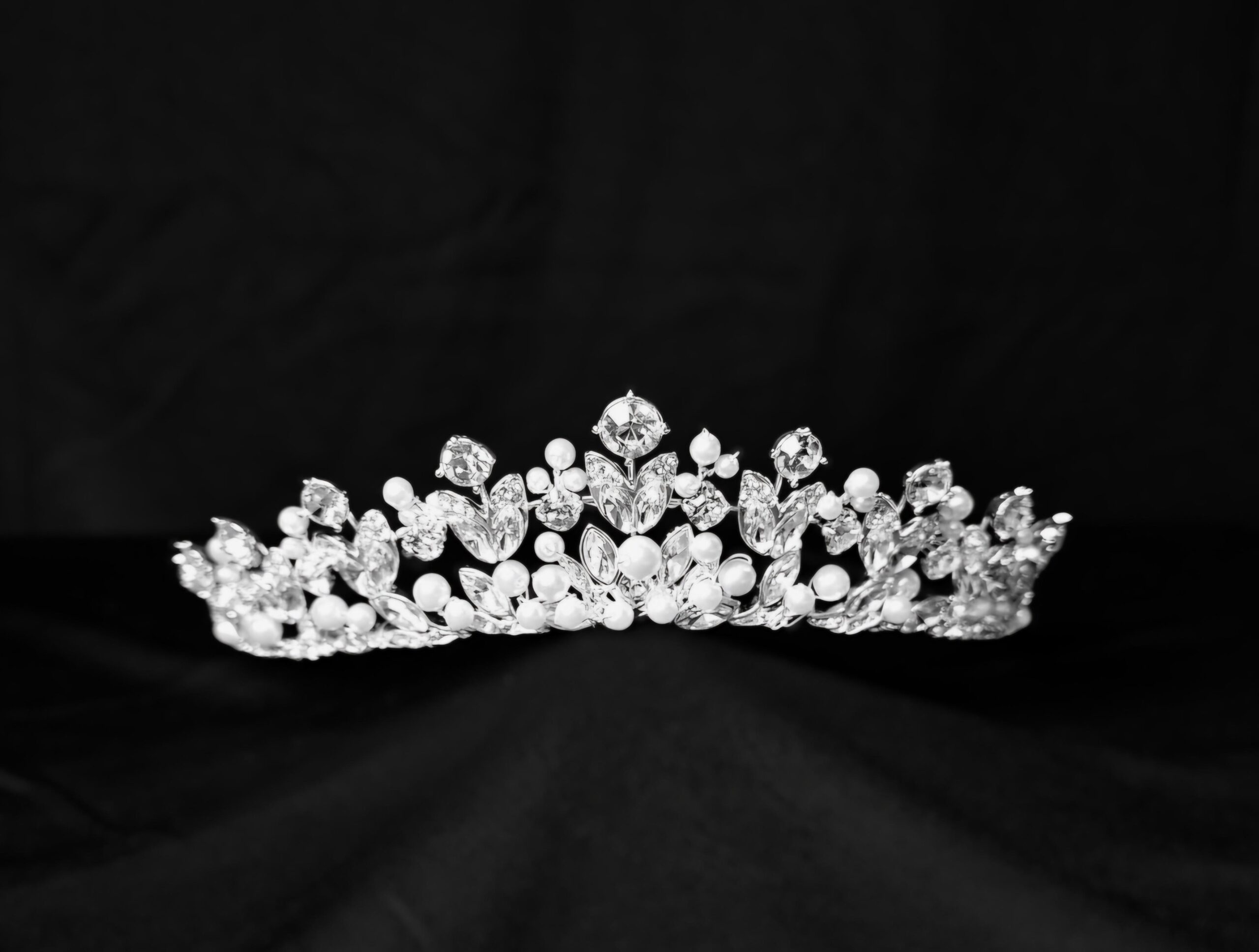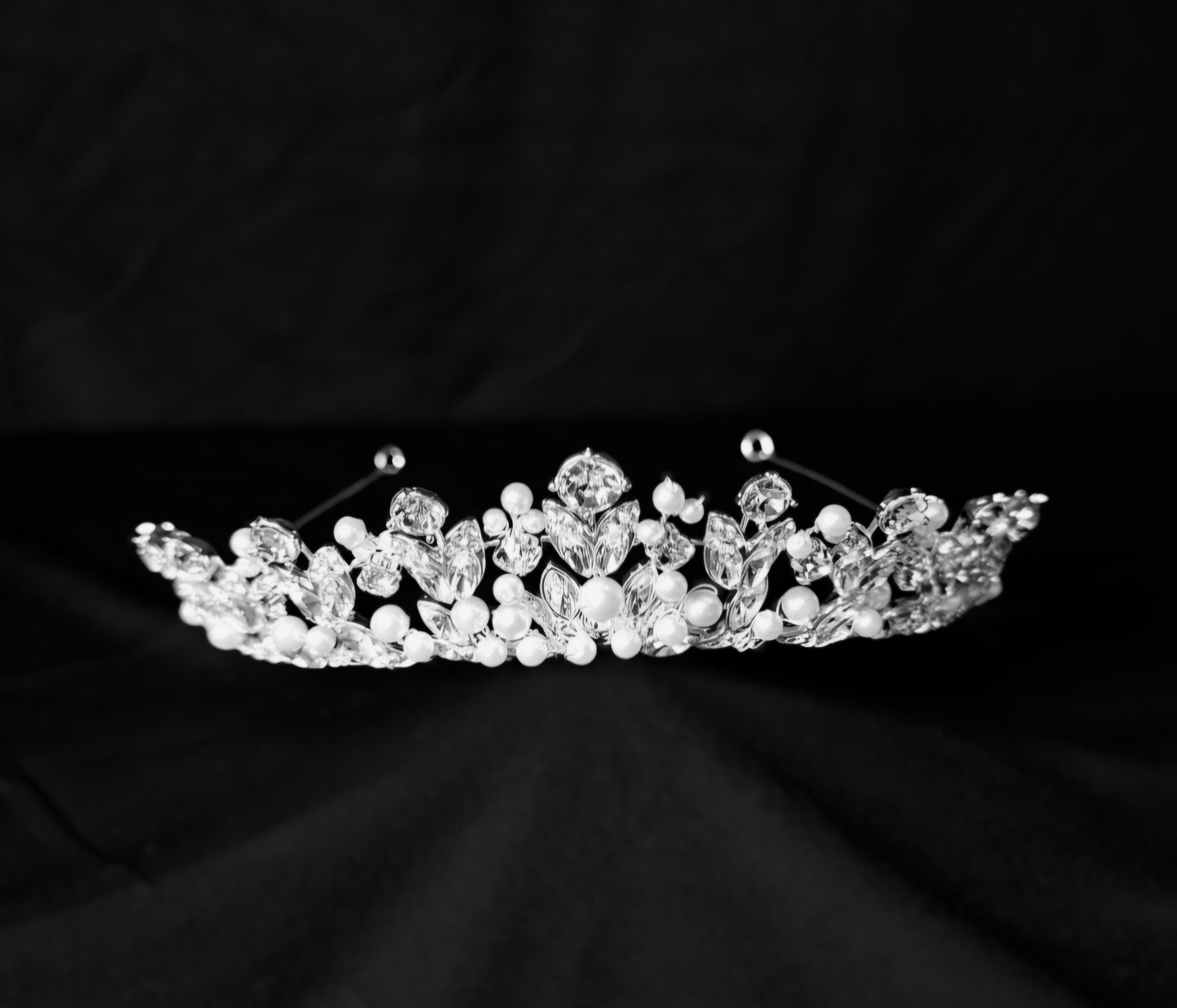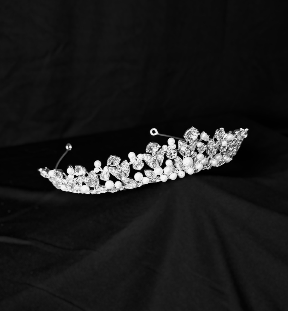 Beautiful statement piece tiara, made up of clear diamante with hand tied pearls added to finish.