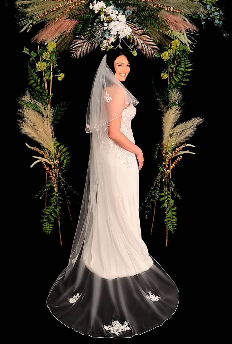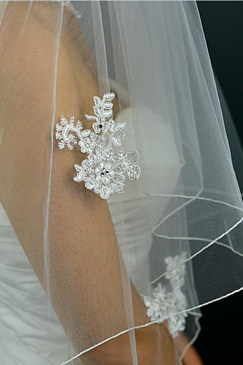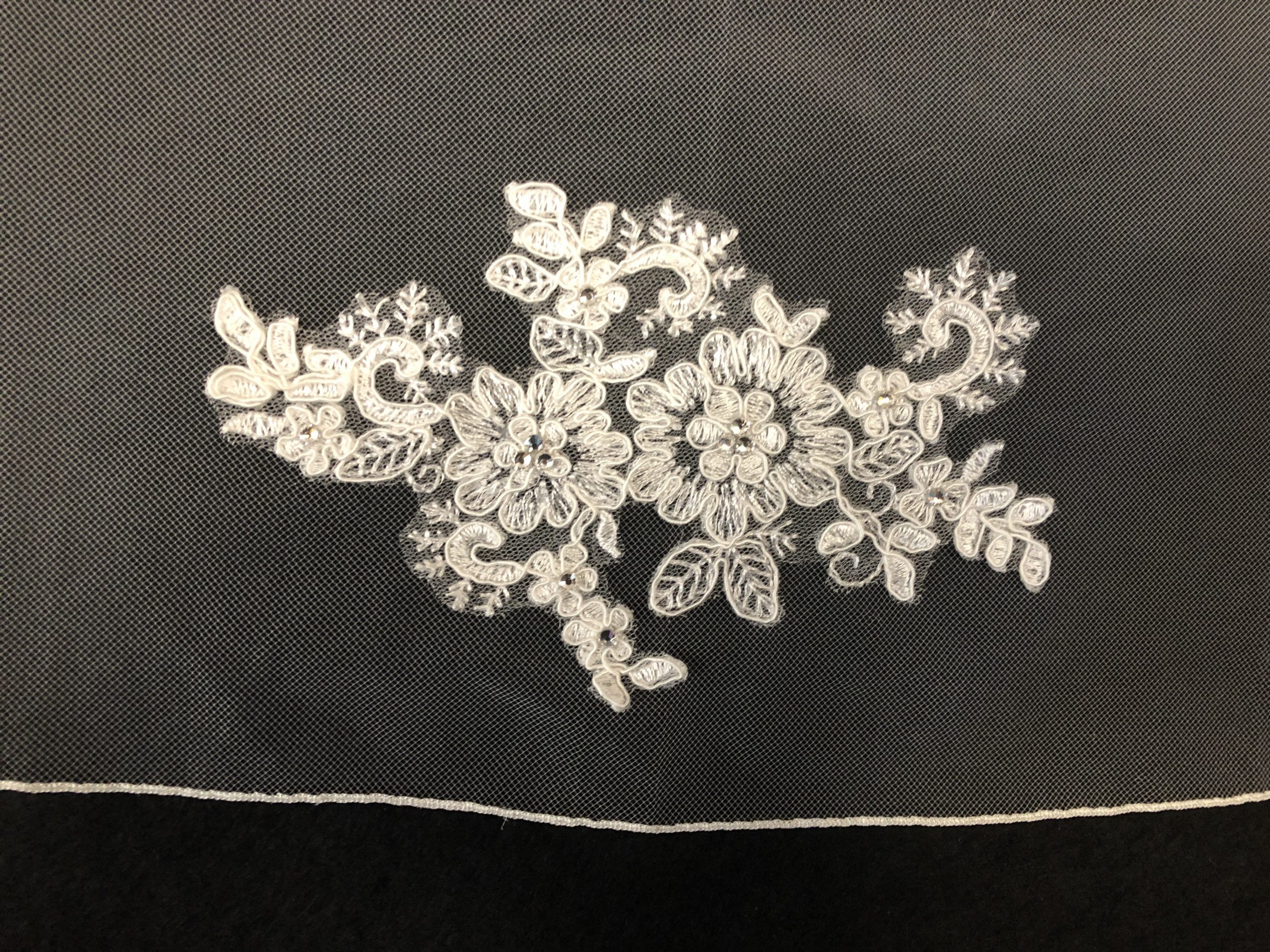 Stunning veil with applique lace symmetrically placed.
