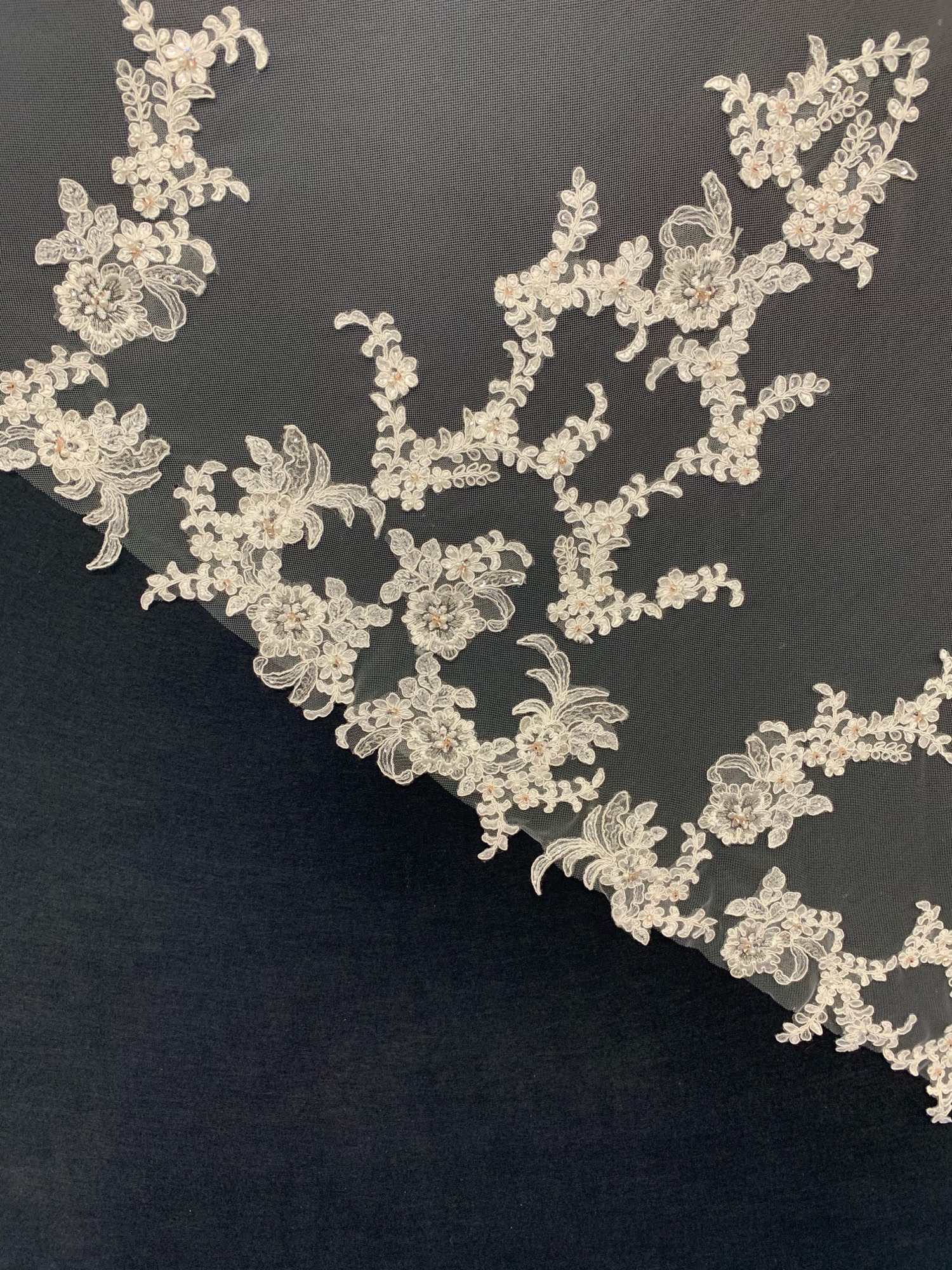 A beautiful lace edged veil, the lace is finished with beautiful blush pink Pearls for that extra detail.