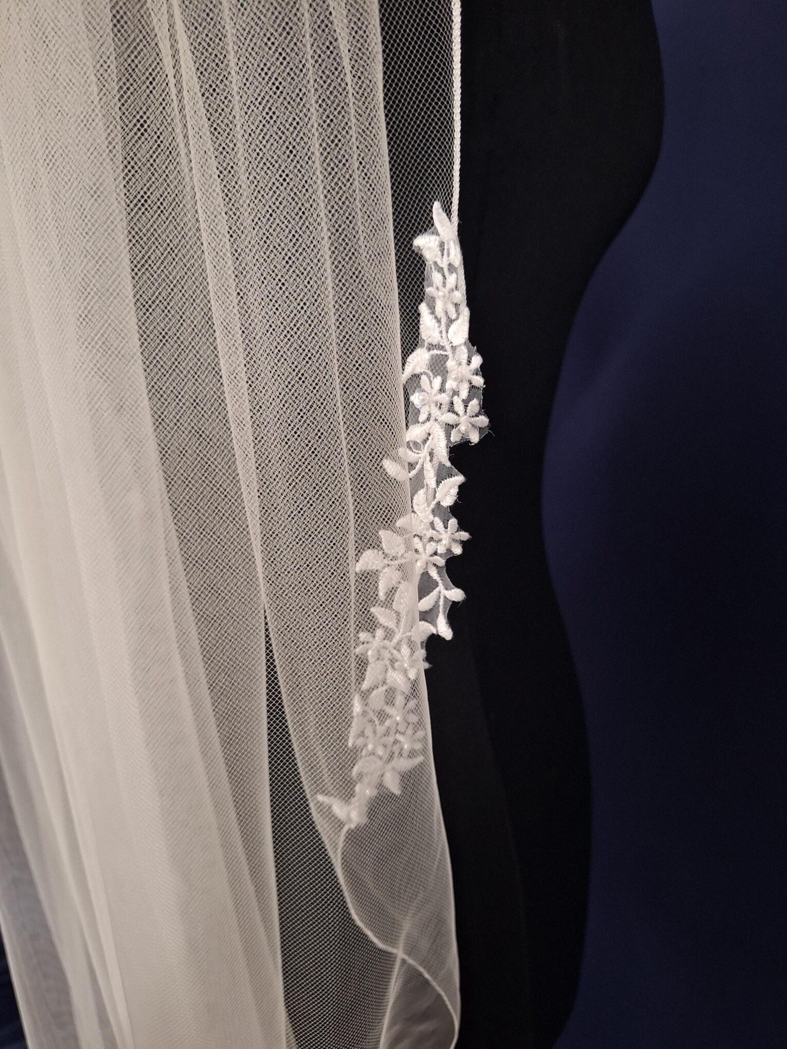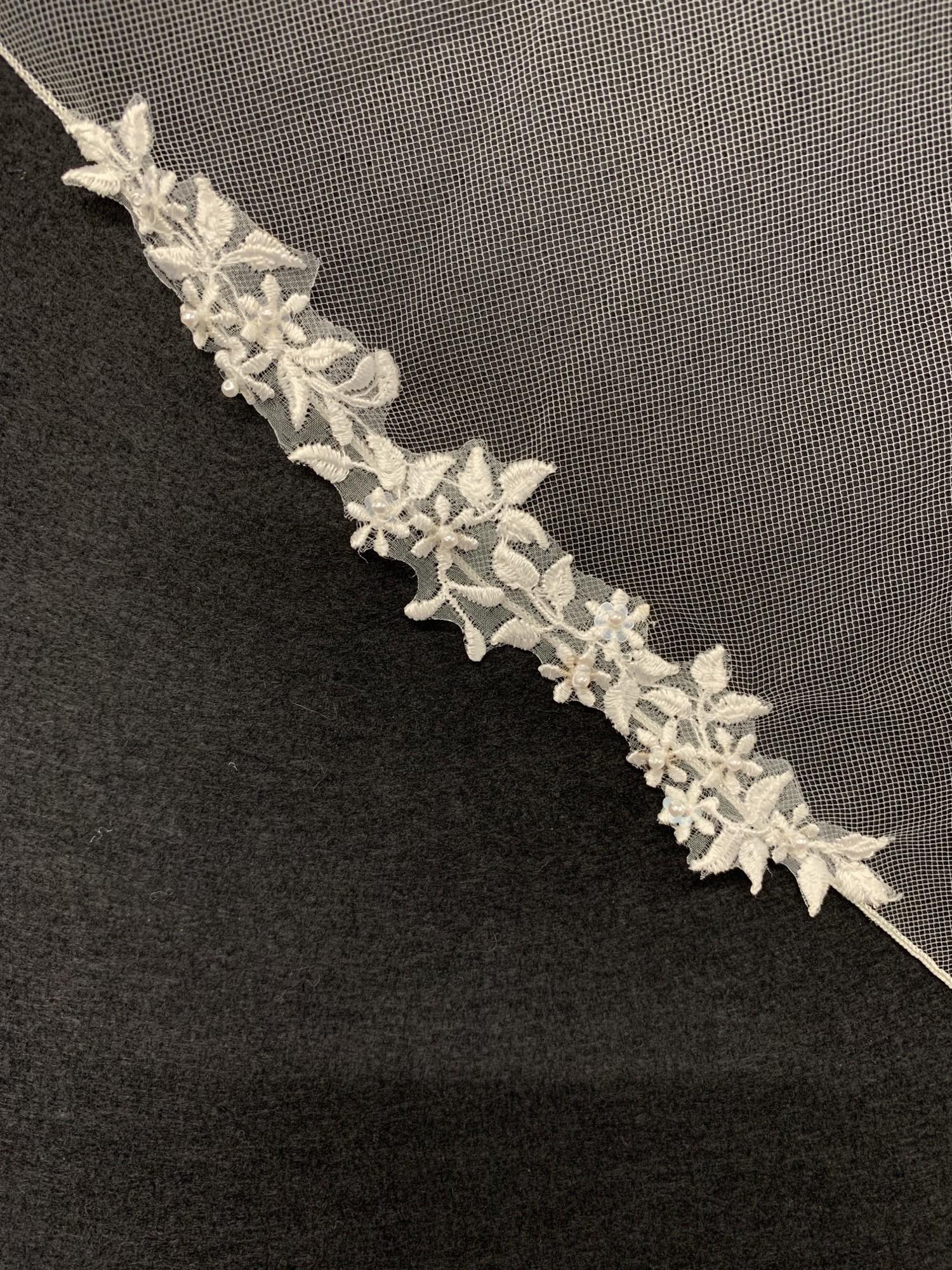 A delicate lace veil, applique lace is placed along the very edge of the veil giving it that perfect finish, this applique has a more leafy detail.