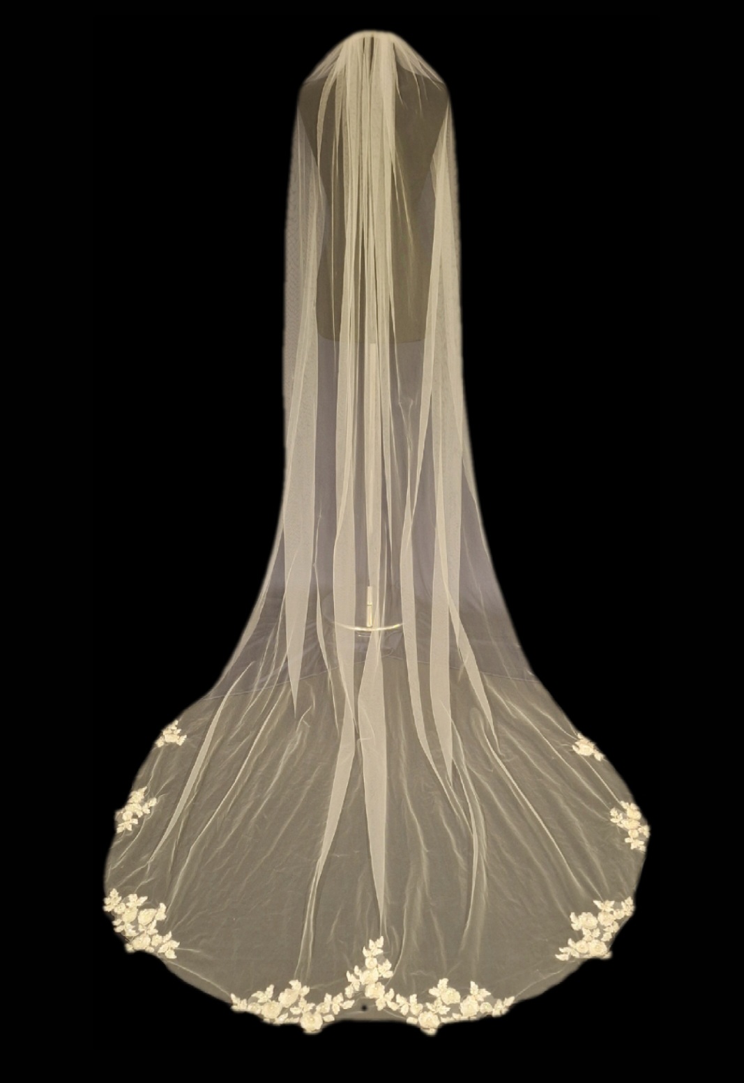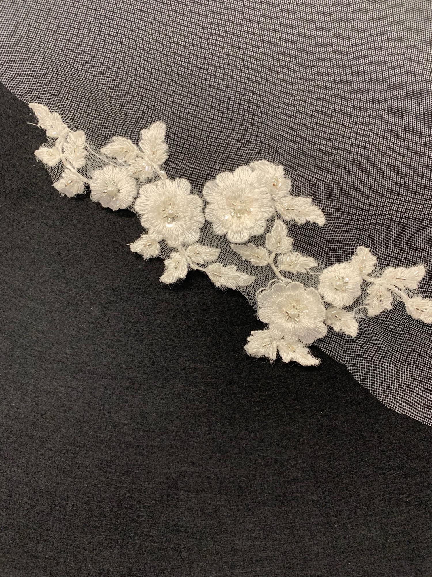 Veil comes in 5 lengths: 54″, 72″, 108″, 126″ and 144″ Available in Ivory, Blush, White and Champagne. (144″ length is currently only available to order in ivory) Available in 1 tier and 2 tier.