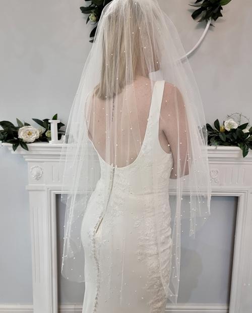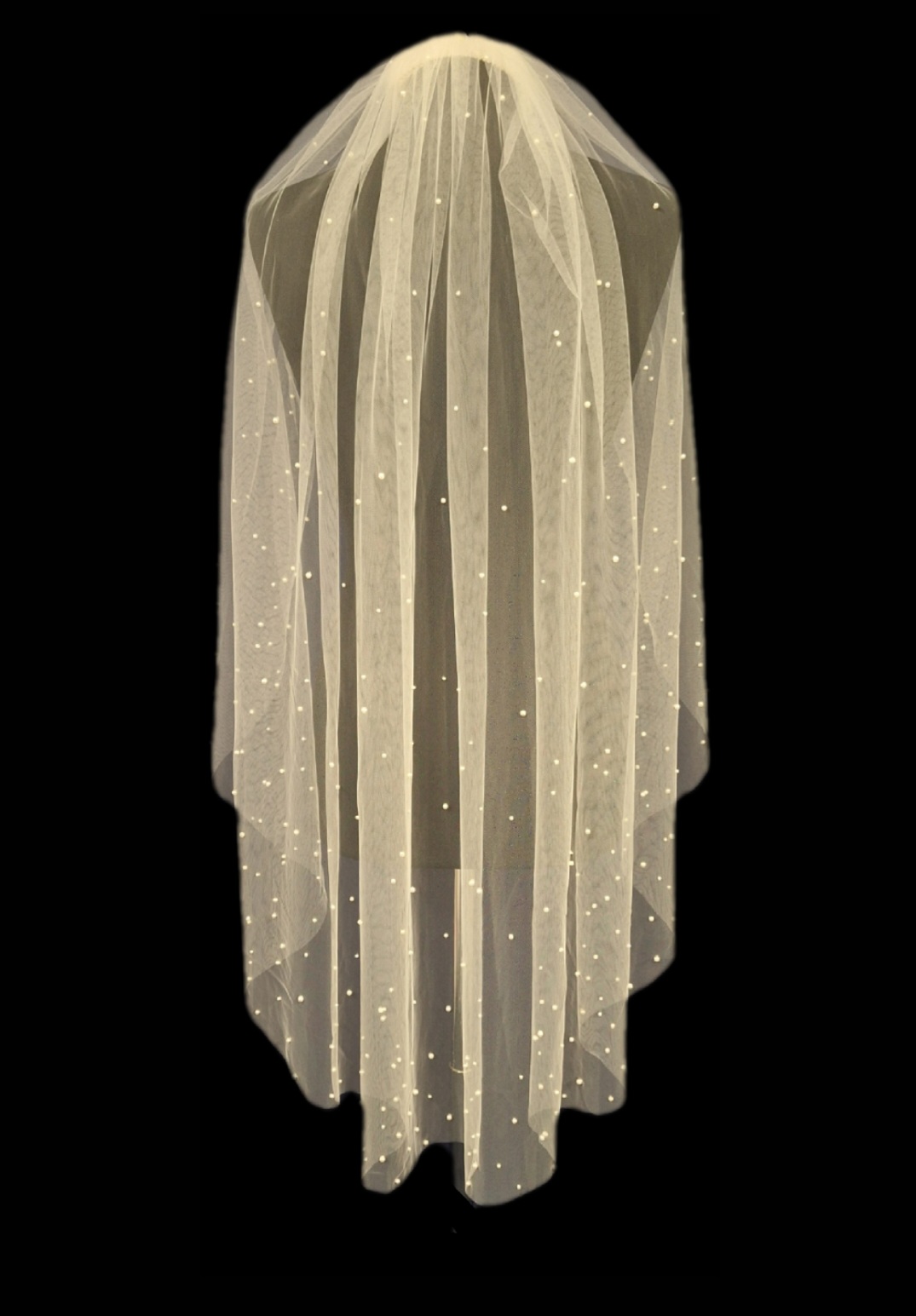 Various size pearls scattered beautifully across soft tulle. This veil is brand new so please bare with us for professional images. Available in Ivory only.