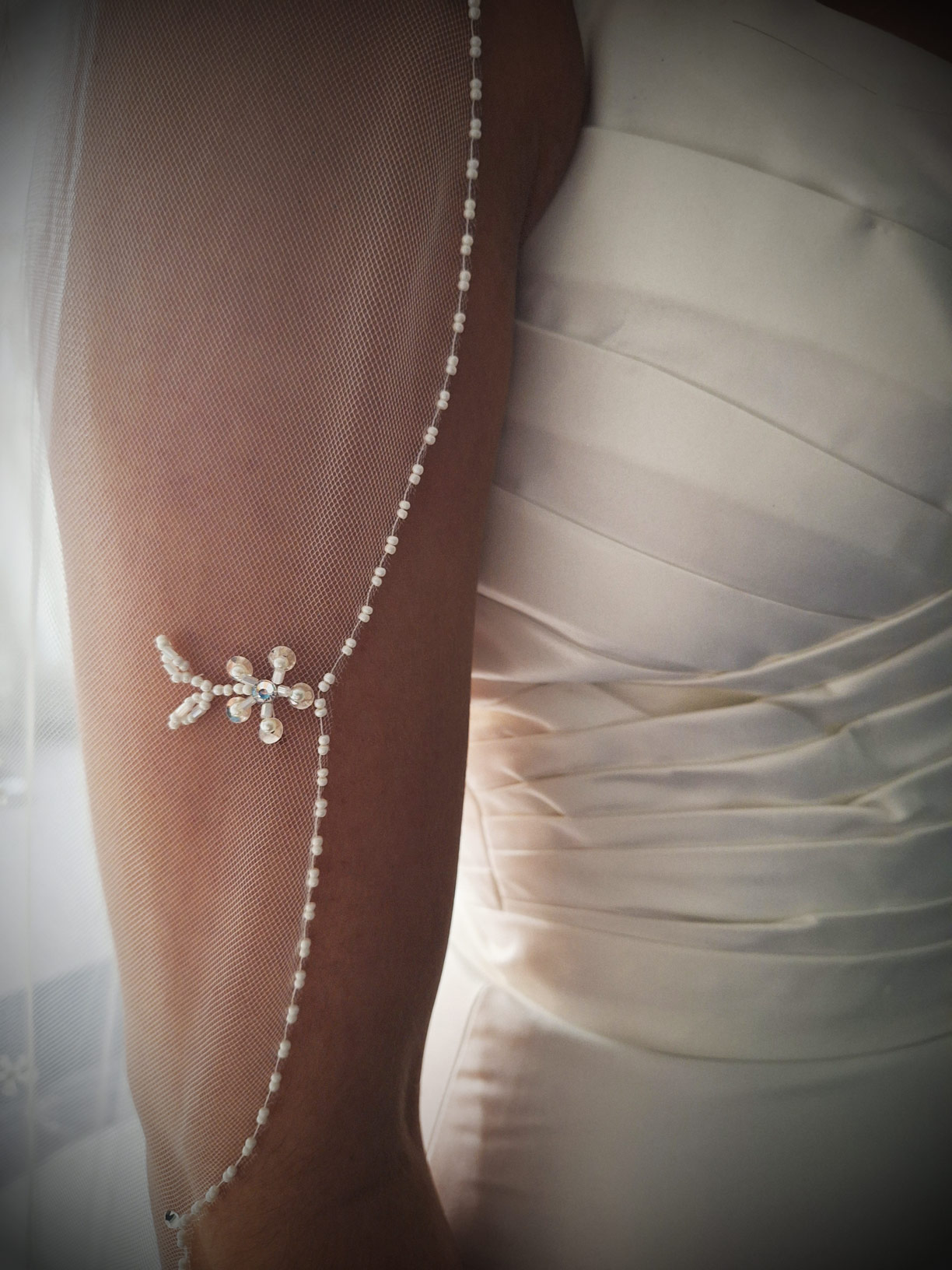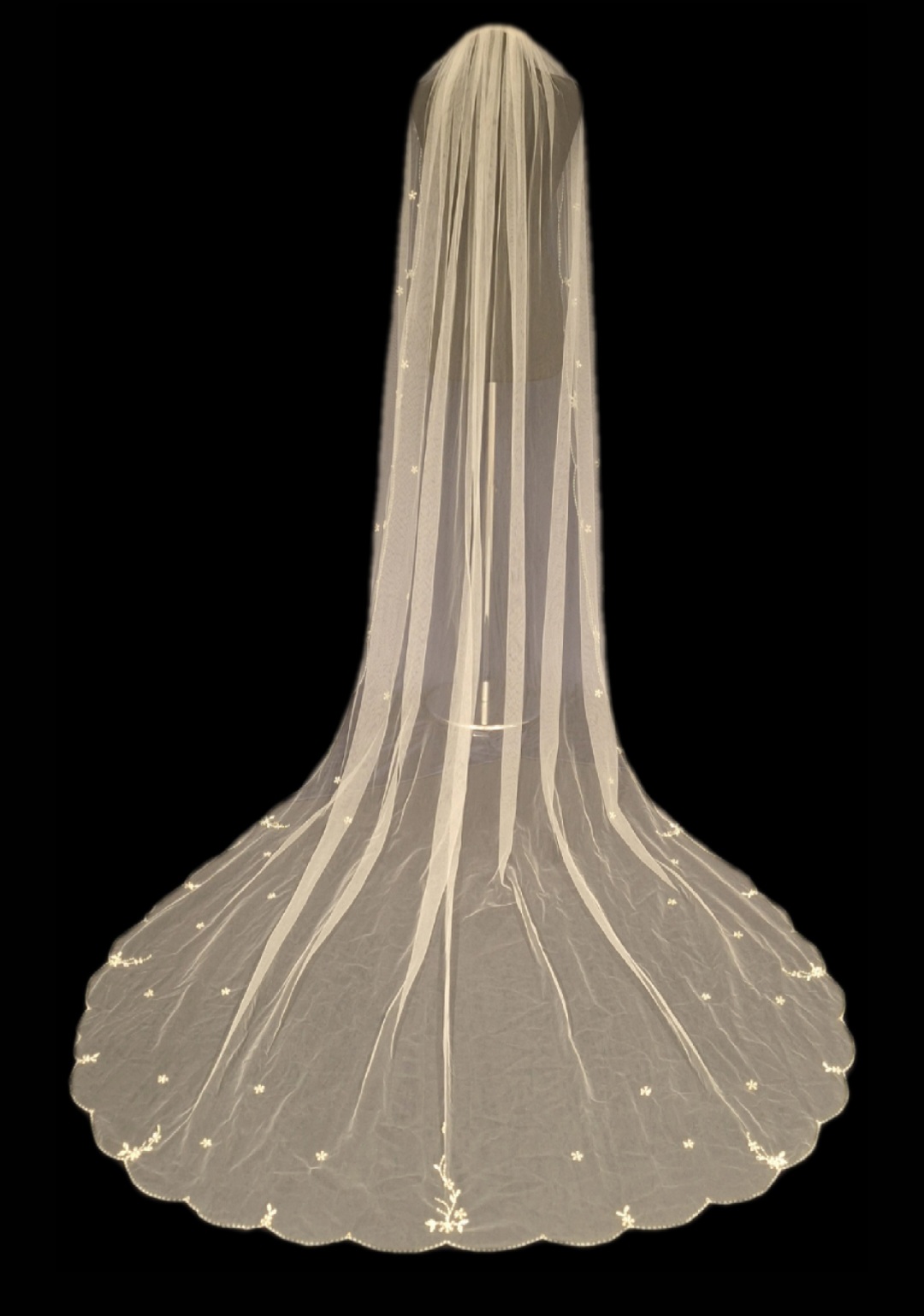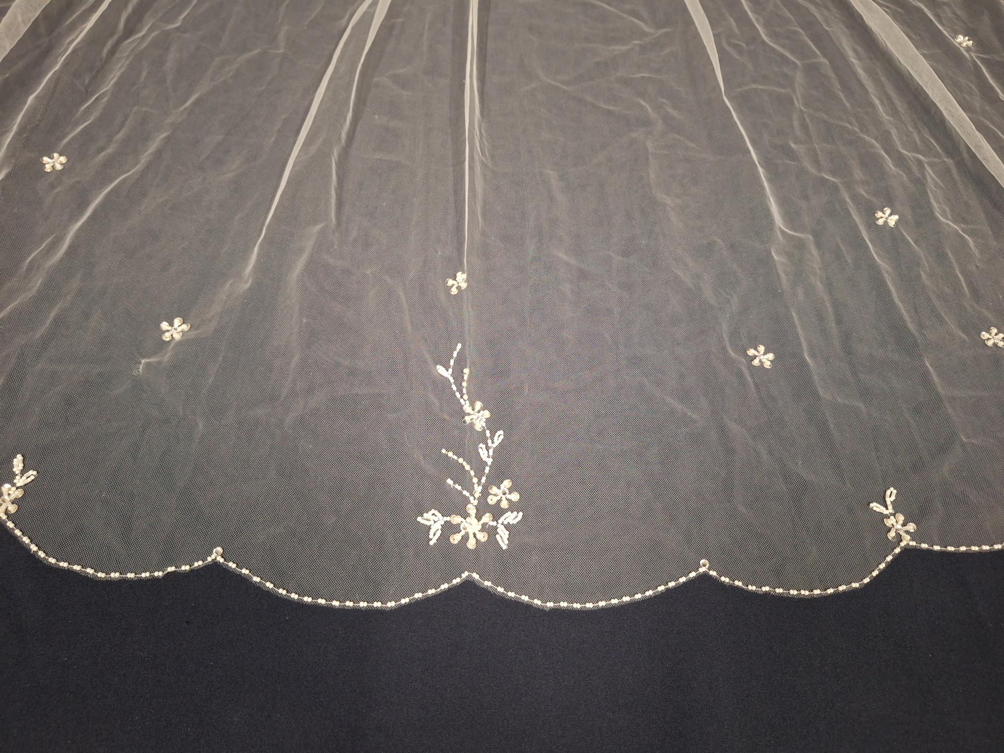 Stunning scallop edged veil with a beautiful flower design created from clear and white Crystal beads.