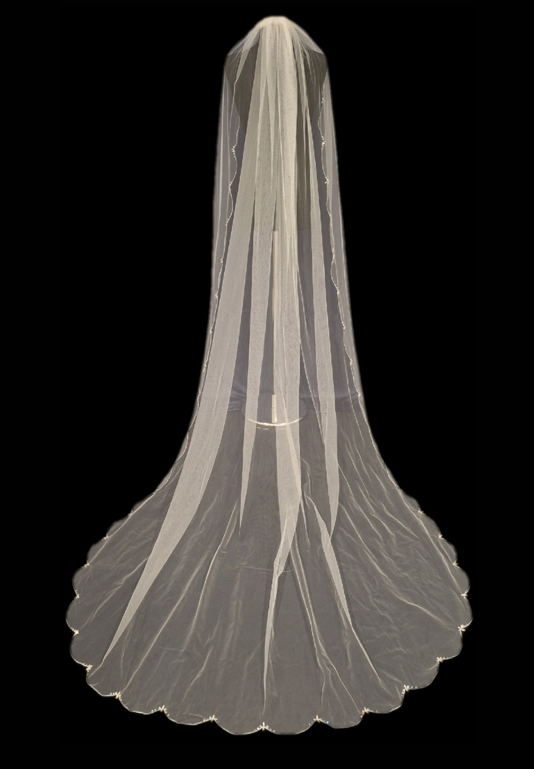 Stunning pencil edged scallop veil with droplet Pearl and clear Crystals at the highest point of each scallop.