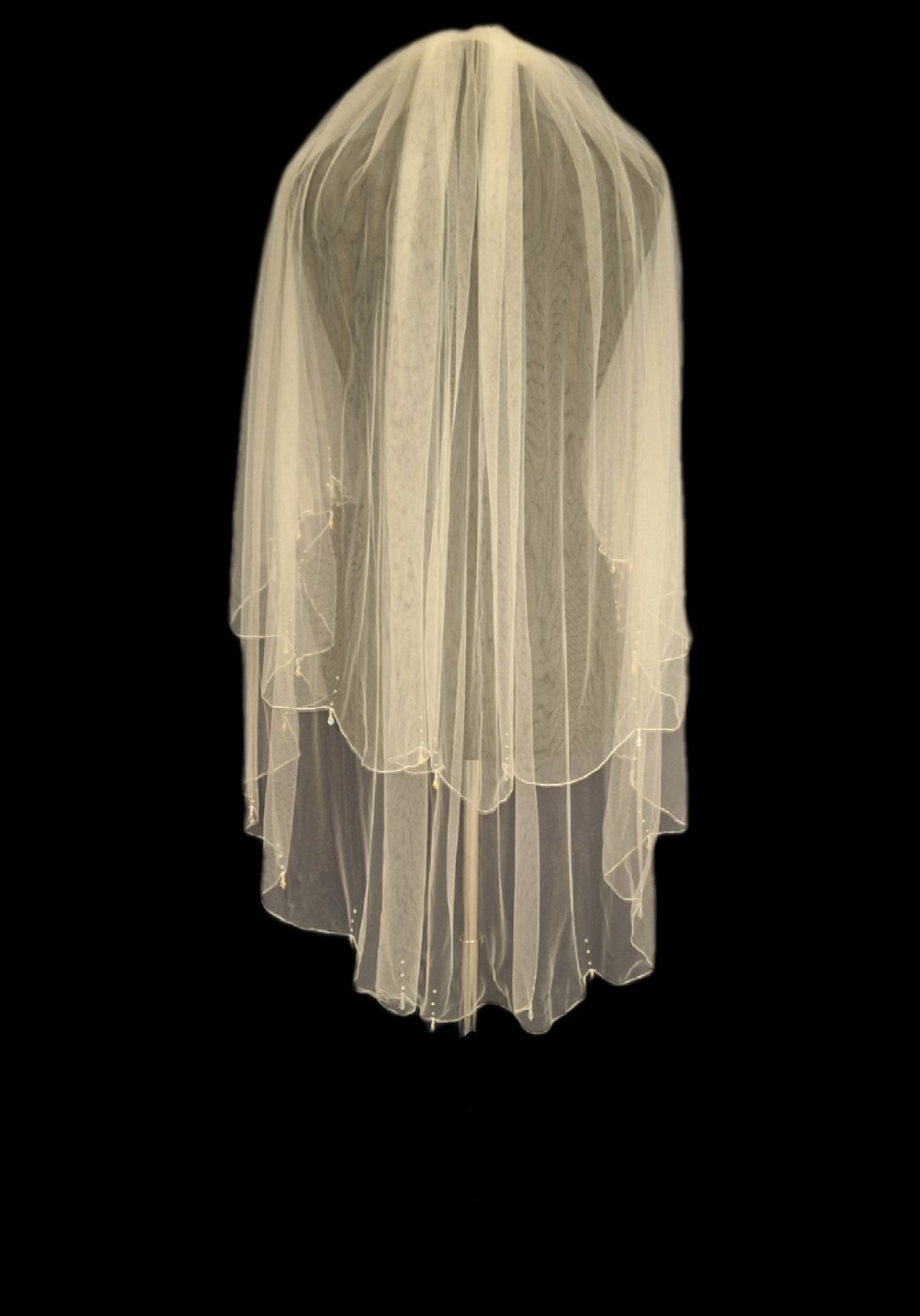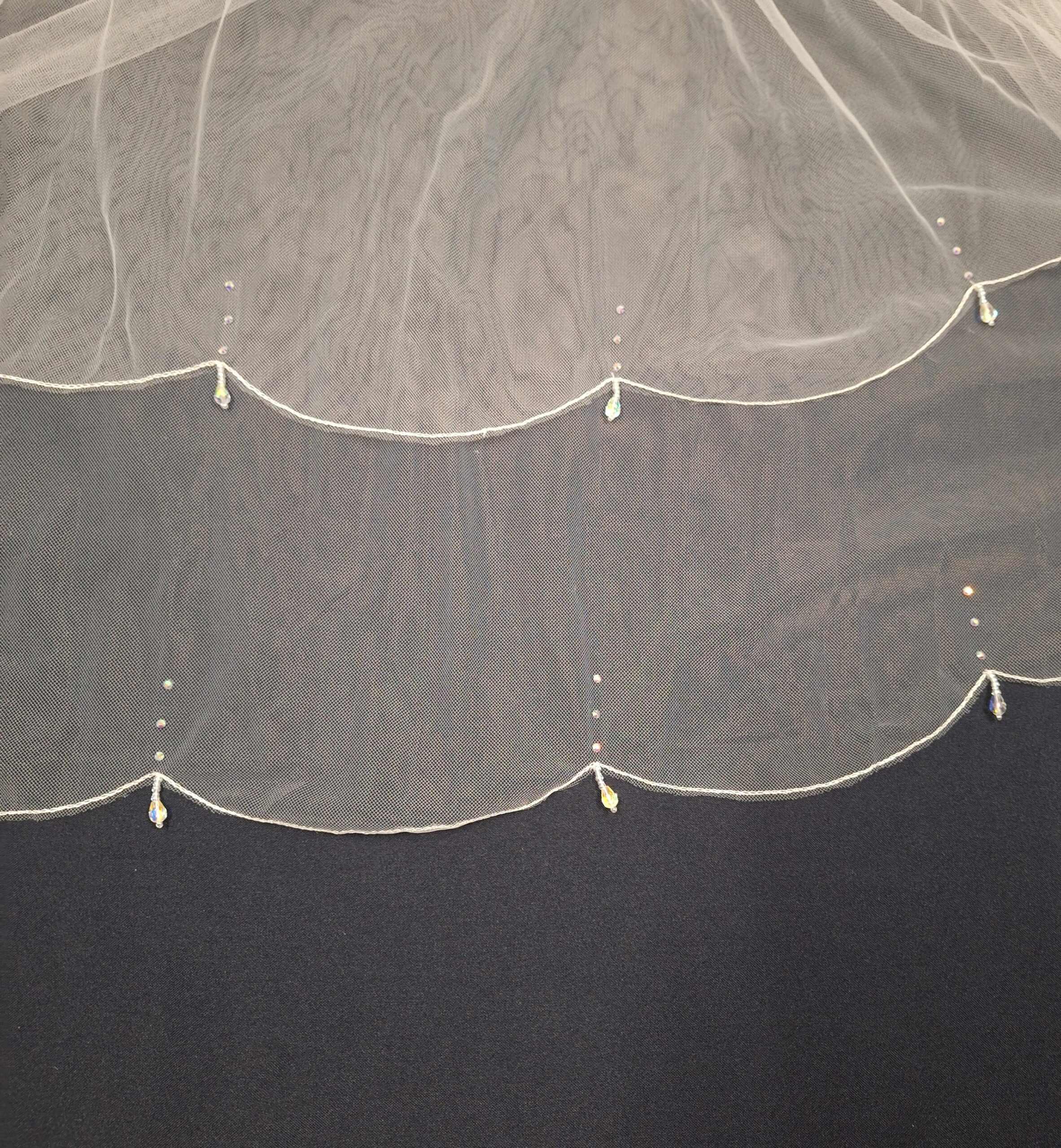 Delicate pencil scallop edged veil. decorated with clear Crystals and droplet clear Crystal beads at the highest point of each scallop.