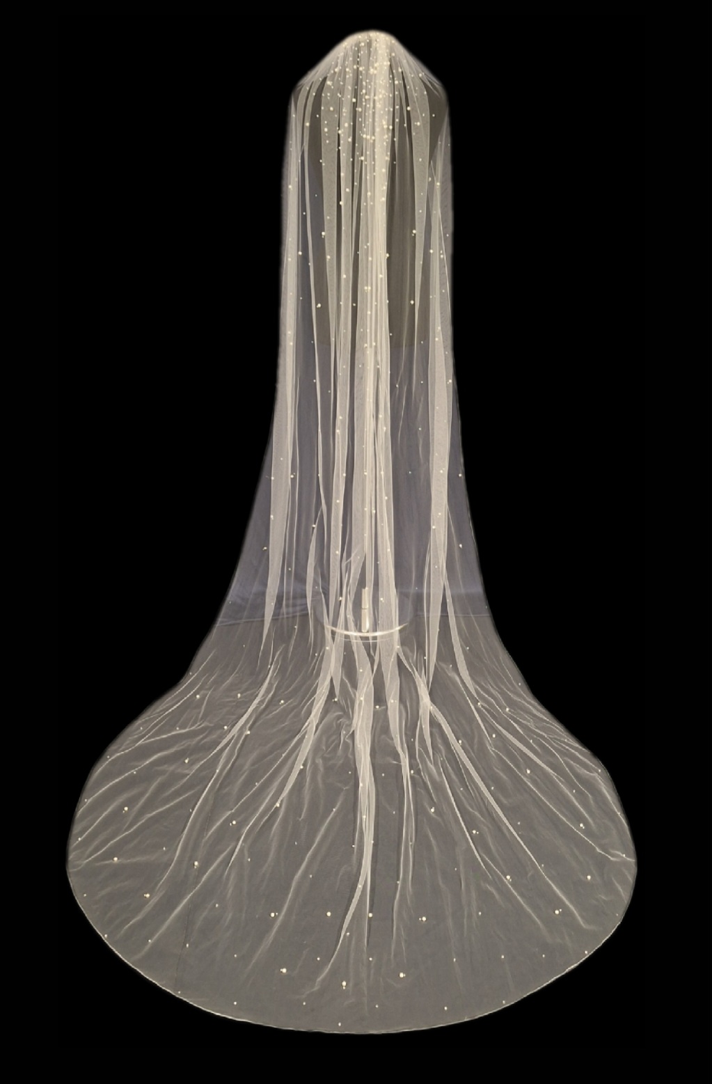 Stunning pencil edged veil with different sized Pearls cascading down the veil from the hair comb scattered throughout the entire veil.