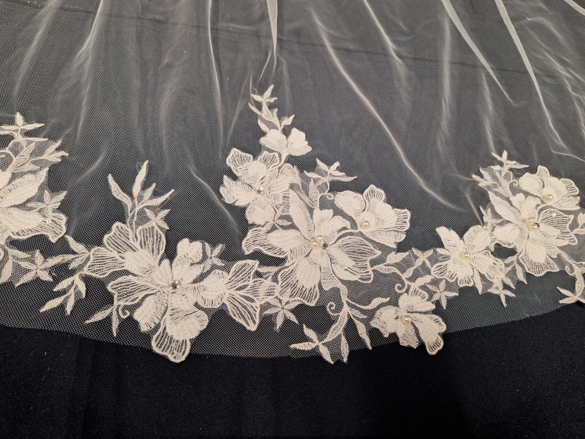 A beautiful lace designed veil, the motif is large flowers with pearls in the centres, giving this veil the perfect finish.