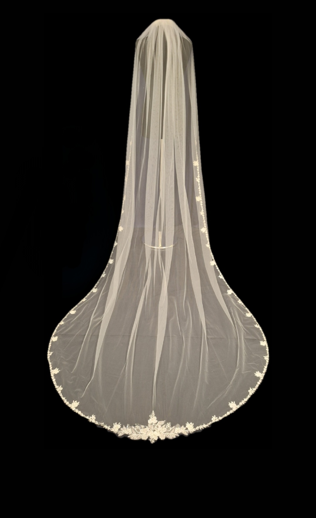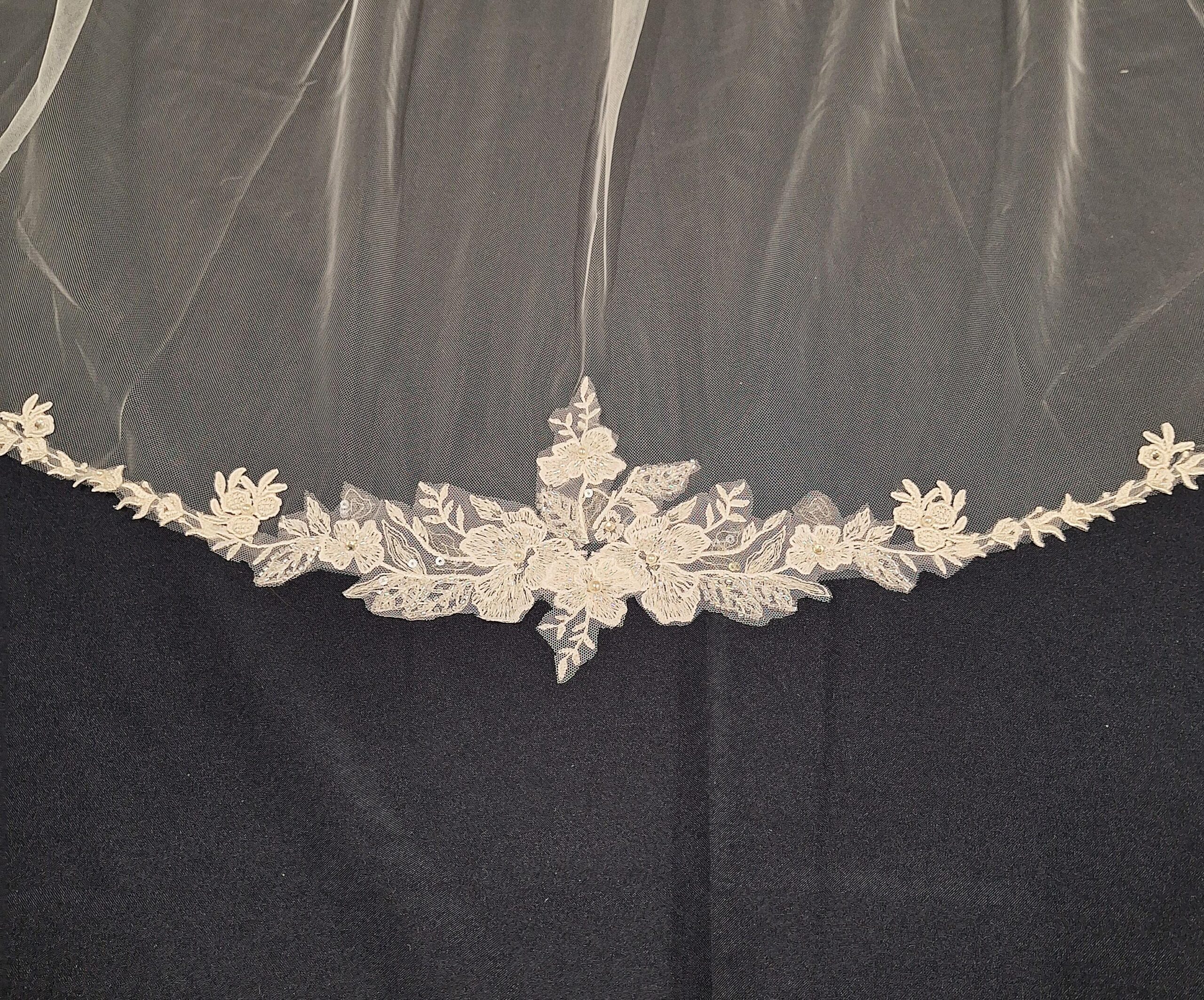 Simply elegant lace veil, with a larger flower motif at the bottom of the veil it has the wow factor to go with any dress, the lace then continues in a delicate trim around the edge of the veil.