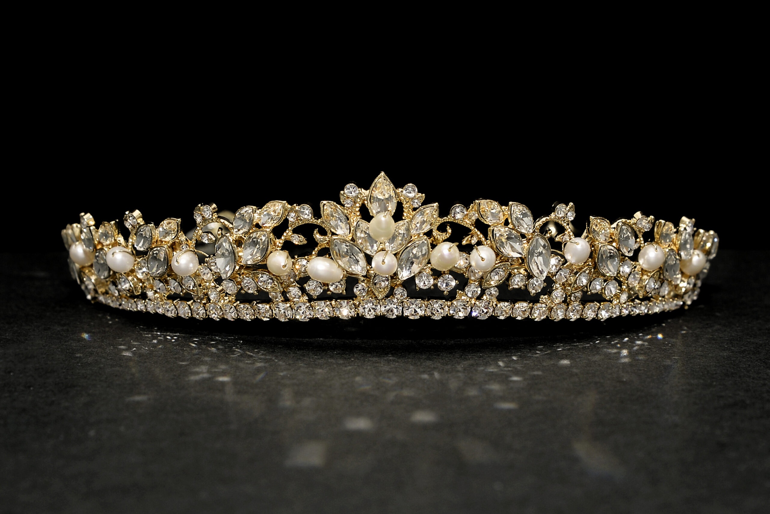 Stunning wow factor tiara, made up of Diamante’s and Pearls, standing 1.5″ at the highest point.