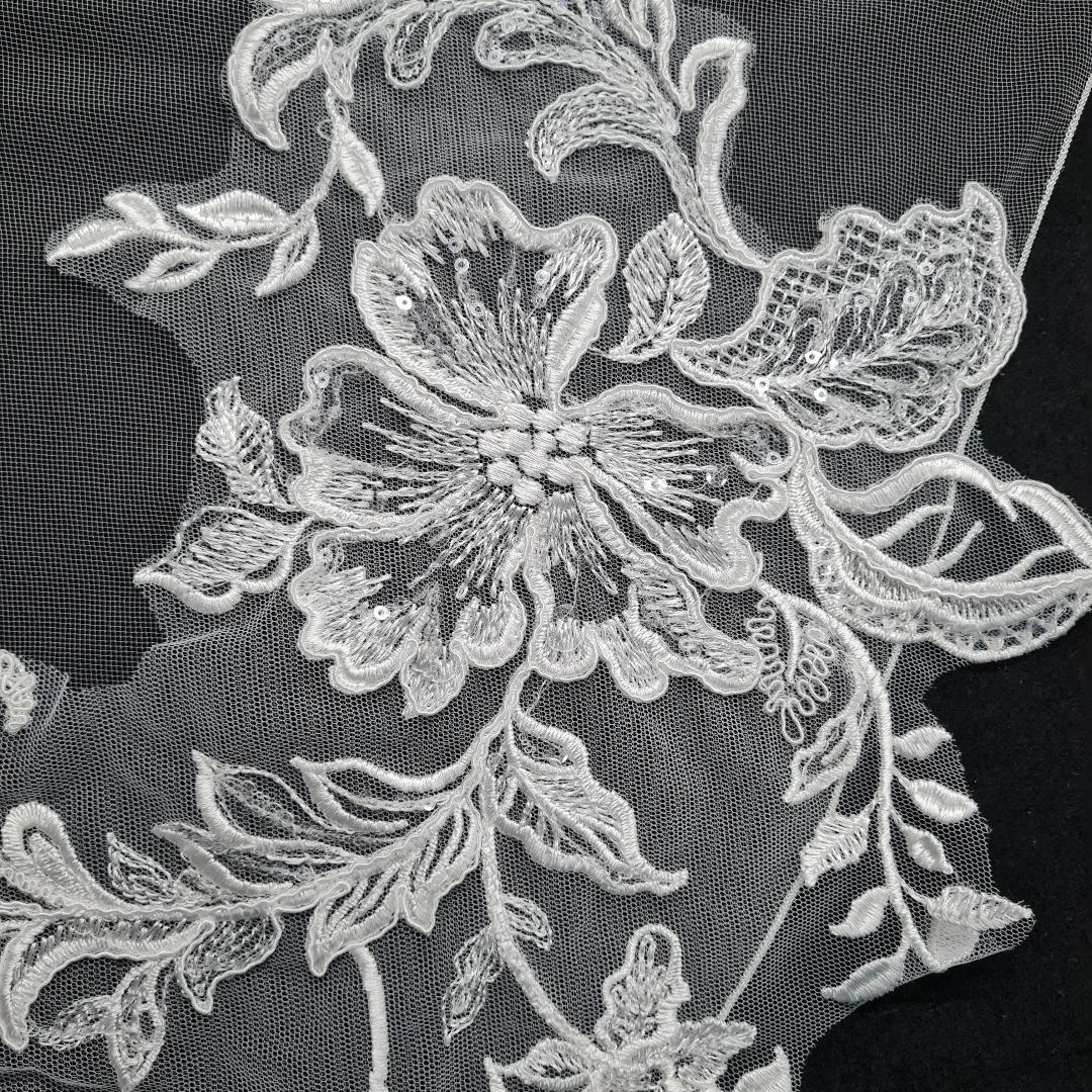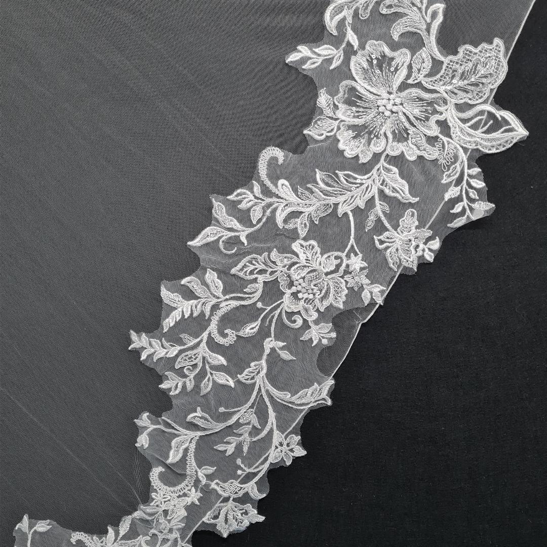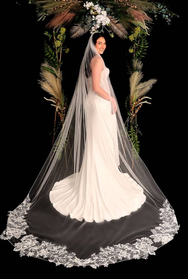 A stunning pencil edged veil, this veil is heavily laced on the train of the veil, when you look closely you will find a heart in the centre.